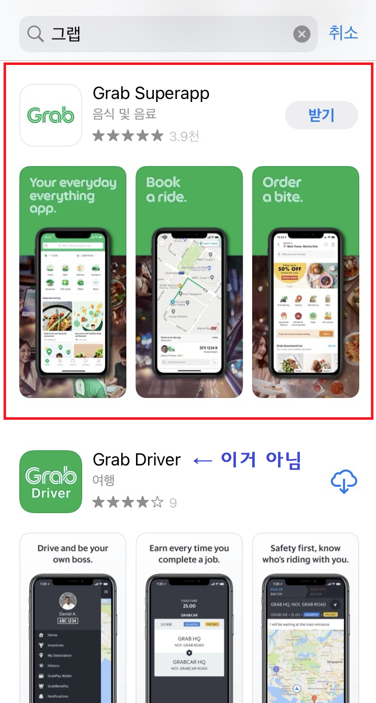 베트남 그랩 사용법의 첫 번째는 어플 설치이다. 앱스토어에 그랩을 검색하면 대표적으로 2개가 뜨는데, 아래의 Driver 말고 위의 Grab Superabb을 설치하면 된다!