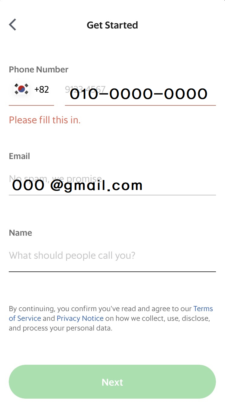 그 다음은 자신의 정보를 기입해야 한다. 나와있는 대로 한국 핸드폰번호 그리고 구글 이메일을 적어주면 됨! 나중에 가입한 이메일로 로그인을 하는 방식이다~