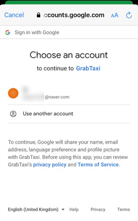 그랩 회원가입이 끝났으면 이제 로그인할 차례. 처음 나오는 그랩 창에서 중간의 구글을 클릭해준다.