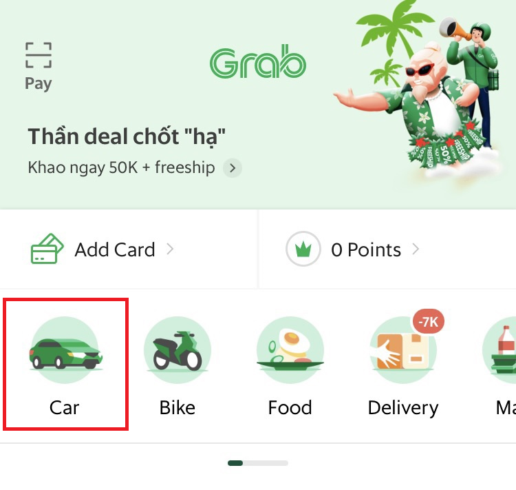 그러면 이제 진짜로 베트남 그랩 사용법, 택시 호출 방법을 알아보자. 베트남에서 그랩 어플을 열면 나오는 위의 화면에서 차 Car 버튼을 눌러준다~!