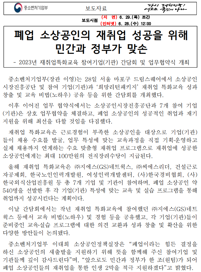 폐업 소상공인의 재취업 성공을 위해 민간과 정부가 맞손