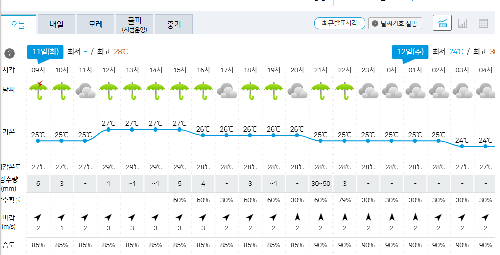 | [기상청 속보]2023년 7월 11일 8시 40분< 강수 현황과 전망 > ○ 현재(08시 40분), 경기남부와 전남남해안의 섬 지역에 호우특보가 발효된 가운데, 돌풍, 천둥.번개를 동반한 시간당 30~60mm의 매우 강한 비가 오는 곳이 있음 * 주요지점 강수량 현황 (11일 00:00부터 08:40 현재, 단위: mm) - 수도권: 고잔(안산) 42.5 대부도(안산) 37.0 경기(수원) 34.0 영종도(중구) 31.0 - 충청권: 부여 37.4 연무(논산) 27.0 정안(공주) 22.0 춘장대(서천) 16.5 아산 15.5 - 전라권: 거문도(여수) 51.0 여서도(완도) 14.5 함라(익산) 12.5 군산 9.7 ○ 오늘(11일) 전국 대부분 지역에 비가 오는 곳이 있겠음 - 특히, 중부지방(강원동해안 제외)과 전라권, 경북북부내륙를 중심으로 내일(12일) 오전까지 돌풍, 천둥.번개를 동반한 시간당 30~60mm의 매우 강한 비가 오는 곳이 있겠으니, 피해 없도록 각별히 유의 - 또한, 강한 비가 내리면서 순간풍속 70km/h(20m/s) 내외의 매우 강한 바람이 부는 곳이 있겠으니, 보행자안전 및 교통안전 각별히 유의 |